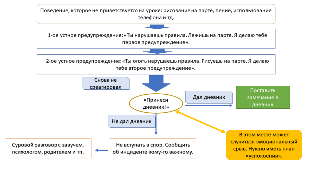 Приведу пример. Один из запросов был следующим: повысить уровень сотрудничества, повысить включенность на уроке, снизить частоту мелких аутостимуляций, которые отвлекают от урока. Ключевым элементом грядущего вмешательства должен был стать дневник. Кстати, про дневник. Это в принципе очень классная идея - использовать естественные элементы учебной среды, а не внедрять новые. В дневник должны были попадать замечания от учителей. В итоге была создана следующая схема работы. Сначала учителем делаются 2 предупреждения. Предупреждения делаются на все виды НП, которые были заранее озвучены ученику. Это важный момент - что алгоритм дневника был предварительно разъяснен ученику. Если клиент хорошо понимает речь, то проговаривание дополнительно повышает эффективность вмешательства. На третий раз уже надо в дневник заносить замечание. Звучит ключевая фраза “принеси дневник”. Если в ответ происходит истерика или что-то тому подобное, то, естественно, в процесс вклинивается схема работы с такими острыми состояниями. То есть выходит, что добровольной передачи дневника не произошло. Поэтому следует дополнительная санкция в виде неприятного разговора с кем-то авторитетным после того, как ученик успокоится. Если дал сам добровольно, то алгоритм отработан на ура. А дальше замечания уже играют роль в домашних договорах относительно мотиваций. И далее алгоритм может снова повториться для нового замечания.